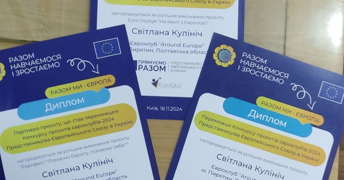 Євроклуб Around Europe отримав нагороду за успішну реалізацію проєкту "Україна + Європа" та як партнер проєктів "Пізнаємо Європу разом" та "Euro Voyaqe"