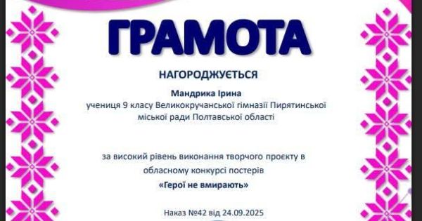 Учениця 9 класу, Мандрика Ірина, отримала грамоту за участь у конкурсі постерів „Герої не вмирають”, організованому Полтавською обласною Малою академією наук учнівської молоді.