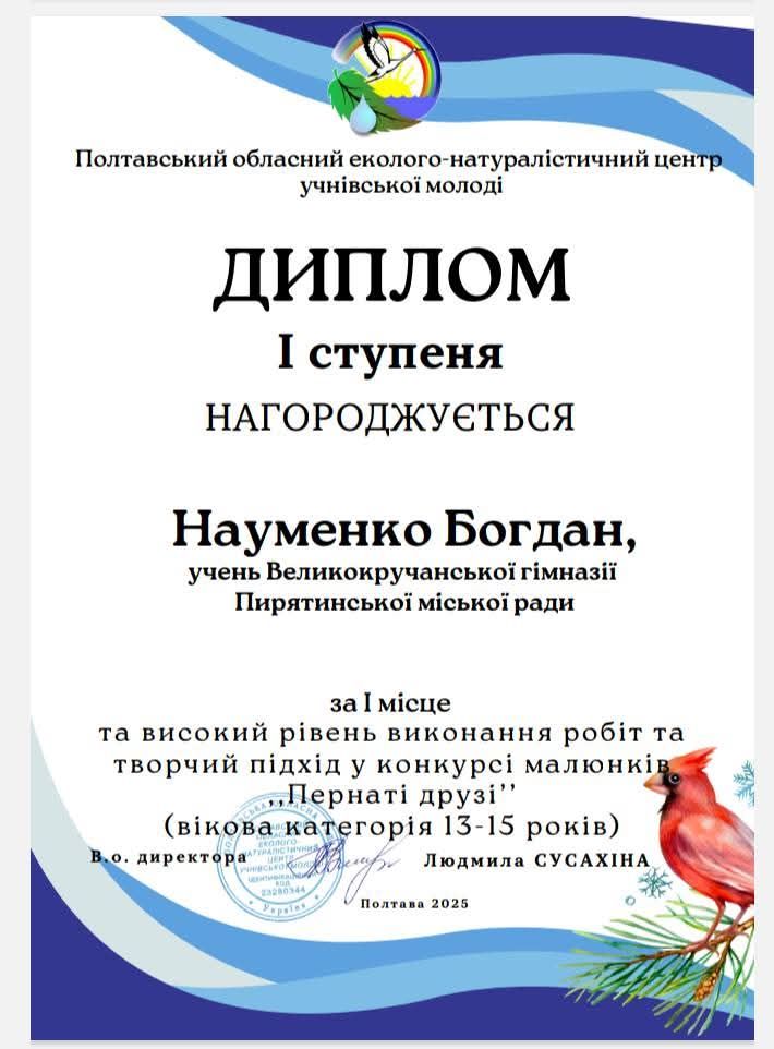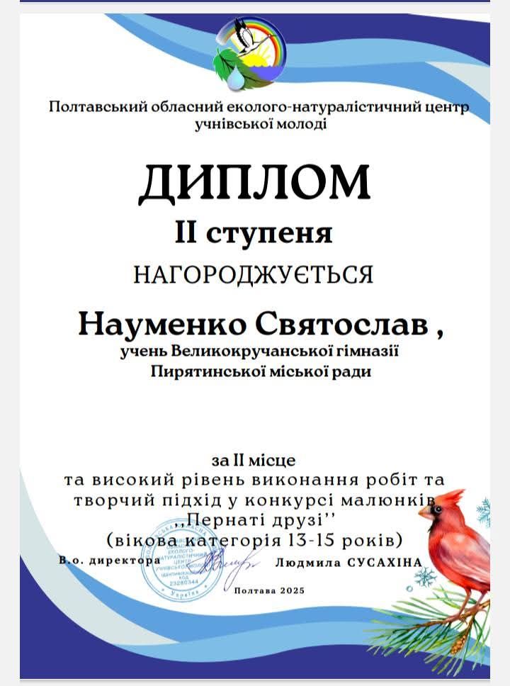 З радістю повідомляємо, що учні нашої гімназії Великокручанська Гімназія Велика Круча здобули призові місця у конкурсі малюнків "Пернаті друзі", який проводив Полтавський обласний еколого-натуралістичний центр учнівської молоді! 💚