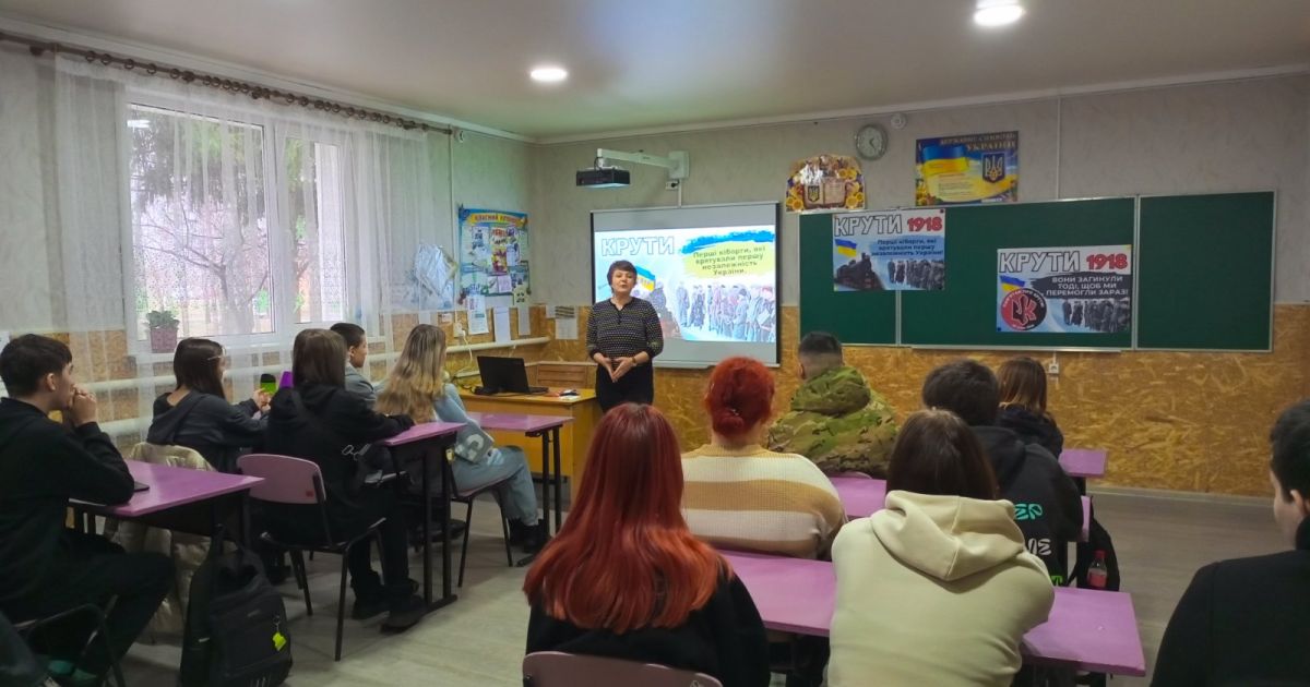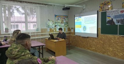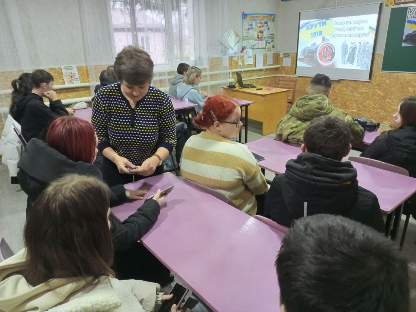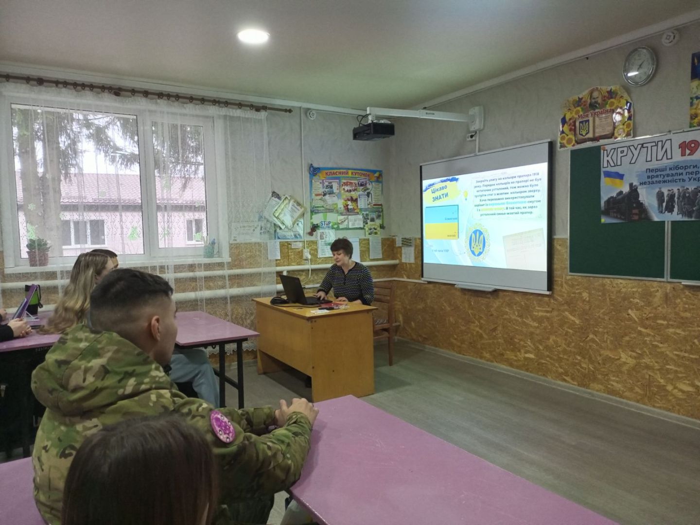 Учні 8 та 9 класів разом з учителькою історії Оришич В. О. взяли участь у грі "Героїчні Крути": засобами реконструкції, спираючись на зв'язок минулого та сучасності, відтворили бій під Крутами в його історичному моменті. За допомогою джерел (документів, фото) діти встановили, хто брав участь у бою та яким був розподіл сил напередодні й після зіткнення, проаналізували хитрощі стратегії воєначальників та труднощі особистого вибору крутян, описали хід бою та підсумували його вплив на утвердження української державності.