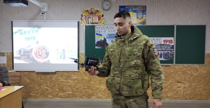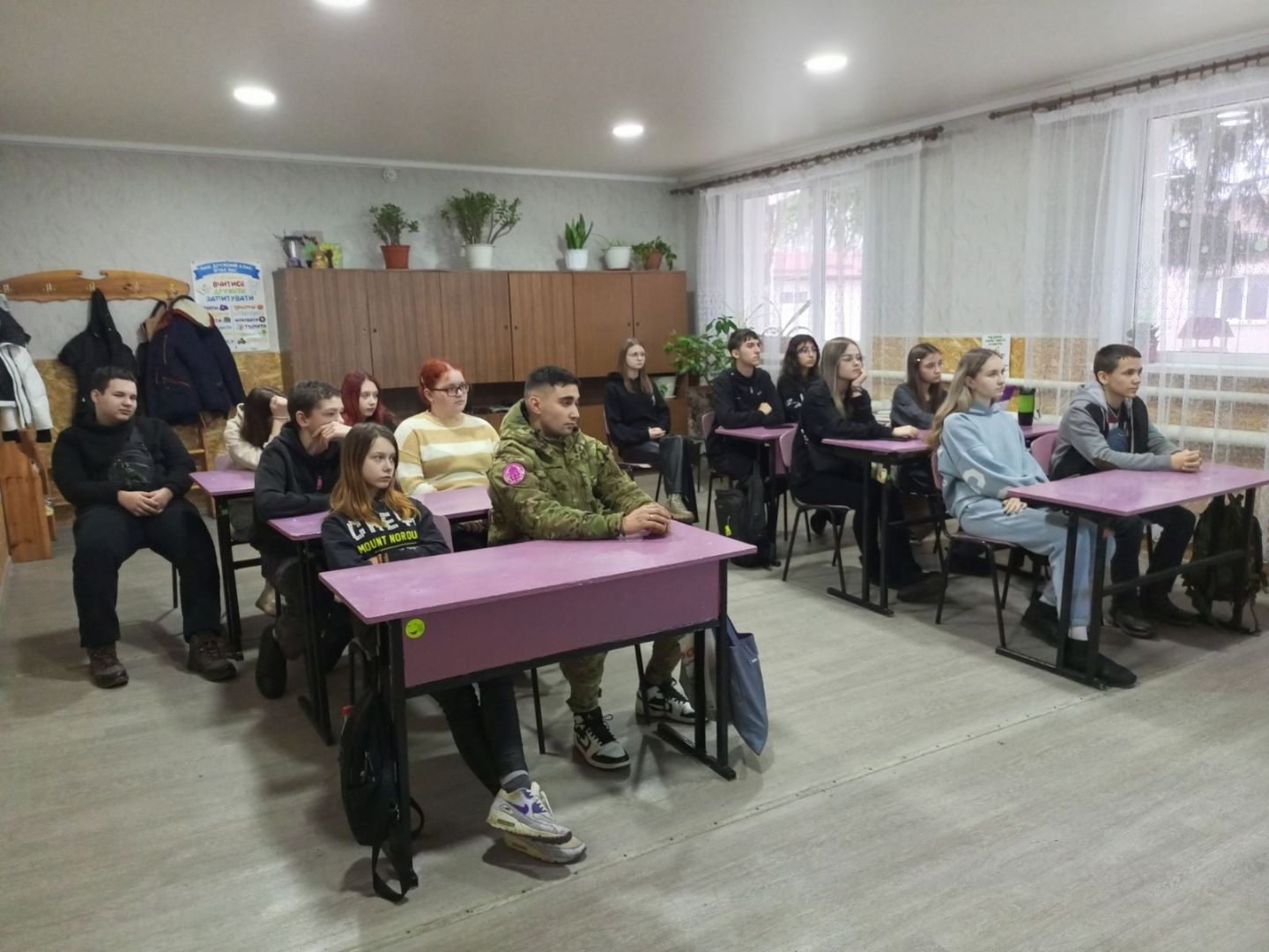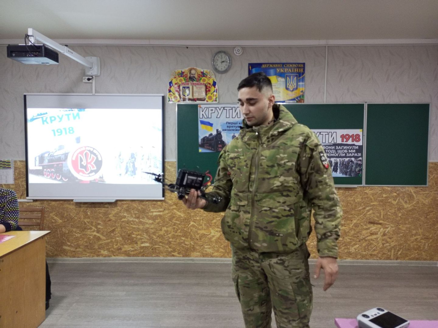 В гості до школярів завітав випускник нашої школи Білоус Б., який розповів про свій бойовий шлях, про нерозривний зв'язок українських героїв минулого із сучасними героями, які стоять на захисті України проти того ж російського ворога сьогодні.
